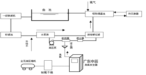 圖中所示先以 2 ~ 3mg/L 在處理槽中,濃度處理 15~ 20 分鐘,然后流入曝氣槽再曝氣到臭氧濃度 0.003mg/L 以下方可用作飼育水,或自然靜置1個小時后方可用作飼育水。