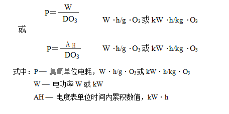 3.電耗計算:以功率表測得數(shù)值或電度表單位時間內(nèi)記錄累積數(shù)值與單位時間內(nèi)臭氧產(chǎn)量之比即為電耗。公式如下: