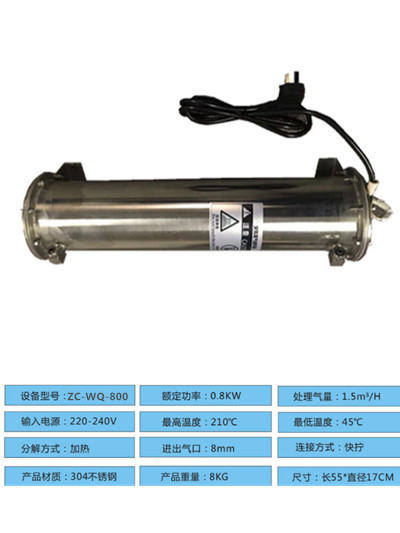尾氣破壞器設計為加熱型。設備全自動運行,采用雙層不銹鋼保護。初次投資和運行費用均底于活性炭催化式、接觸氧化式。尾氣進入反應室后,臭氧分子在通過加熱催化器時得以分解。破壞器由以下元件組成:
